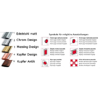 Lieferbar in: Edelstahl matt gebürstet, Edelstahl poliert, Messing poliert, Kupfer poliert und Kupfer Antik.